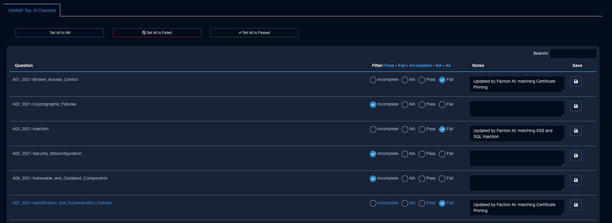 When a vulnerability is updated or deleted, Faction automatically runs a background review of any incomplete checklist items associated with the assessment. The AI compares each checklist item against the full list of vulnerabilities and marks items as Fail where a matching vulnerability is found.