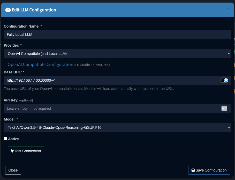 Connect to any API that implements the OpenAI chat completions interface. This option allows fully on-premises AI processing with no data leaving your environment with tools such as LM Studio or Ollama.